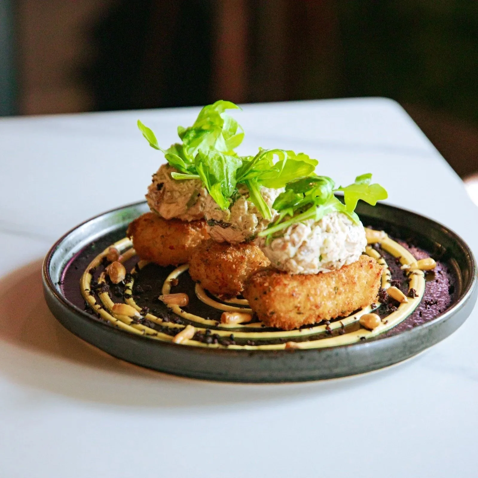 Smoked chicken. Ají amarillo potato croquettes. Arugula. Huancaína